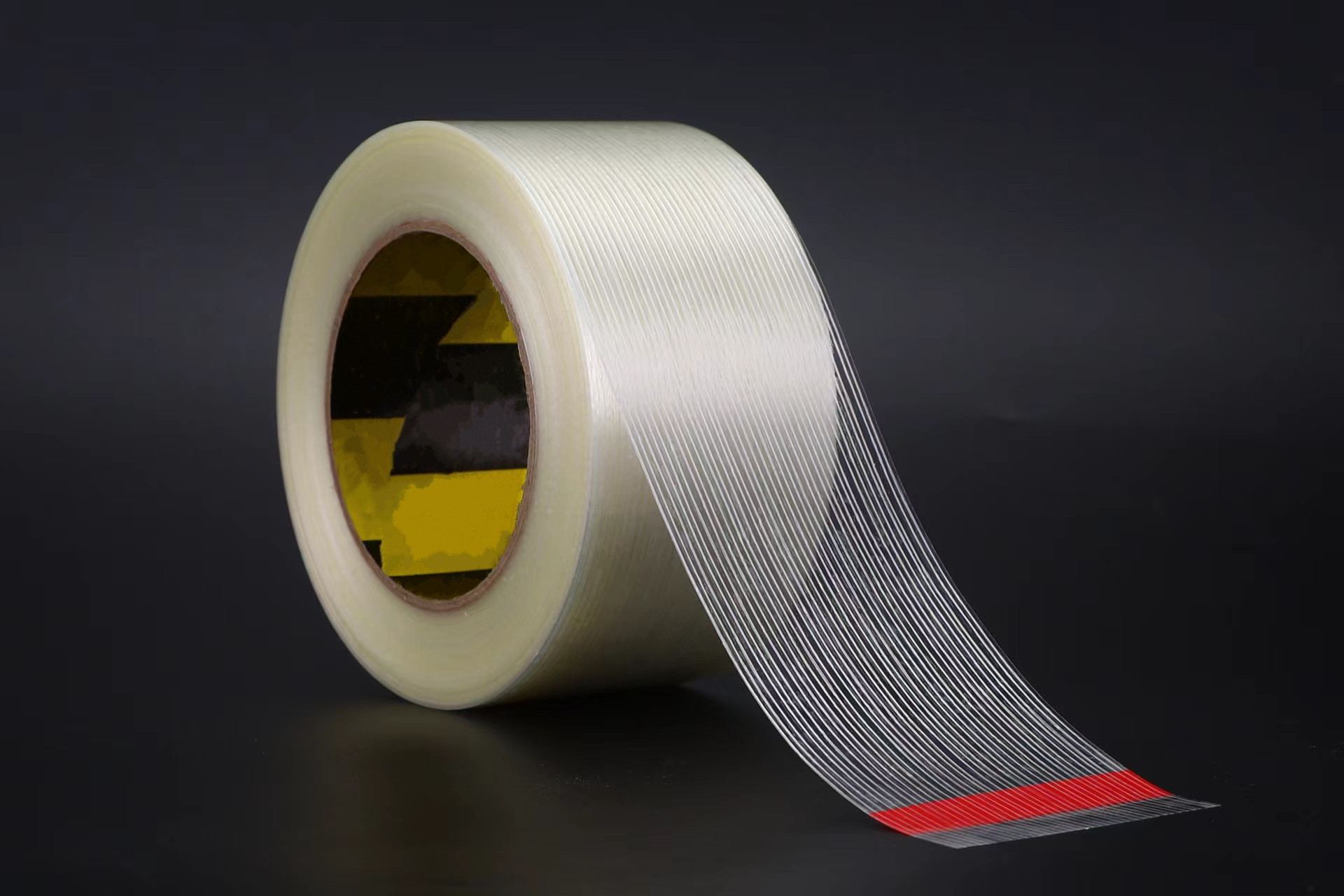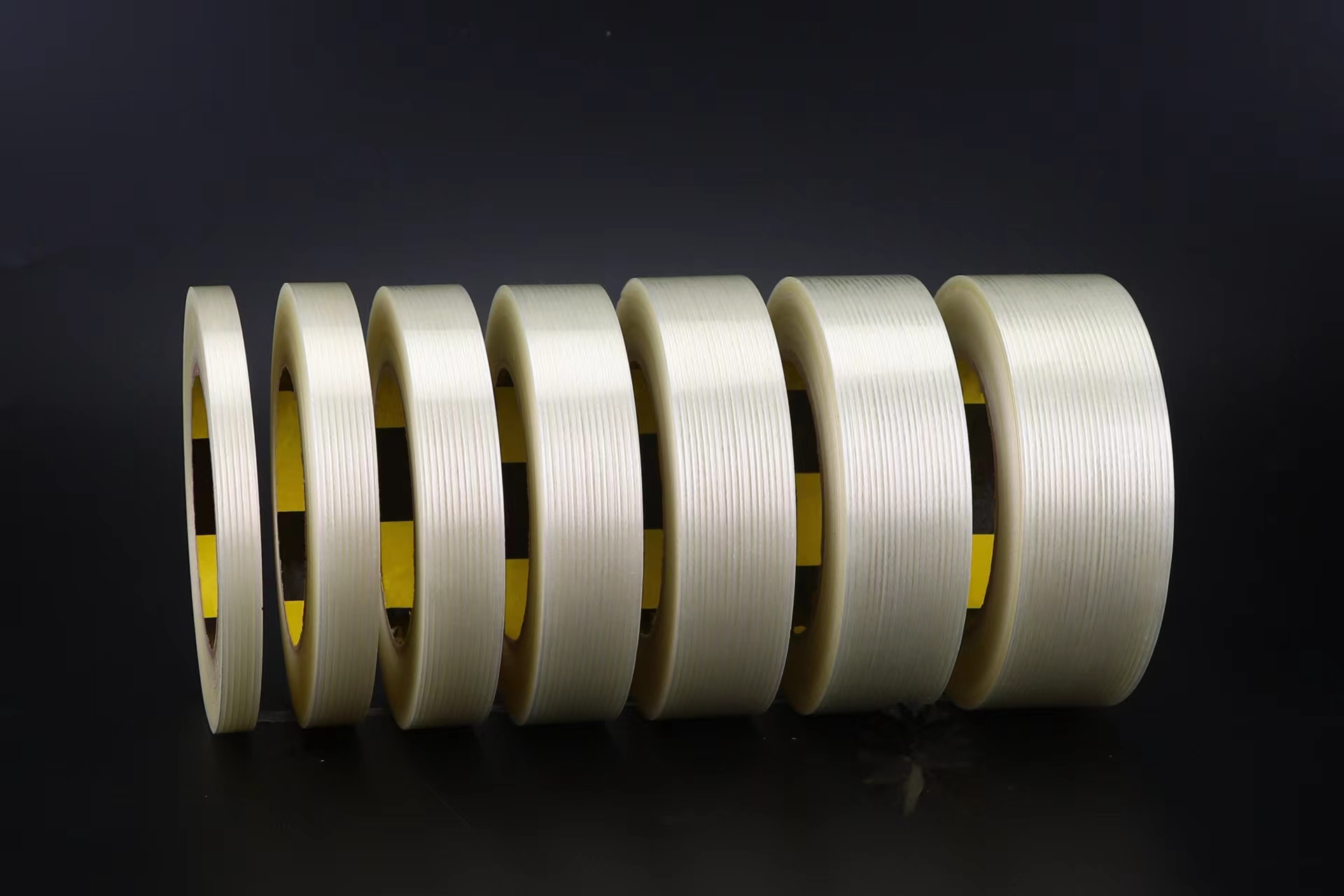 該產品由玻璃纖維絲符合PET薄膜作為基材,單面或雙面涂布膠水,具有極強的粘性,超高抗拉強度,并且具有防水性。適合各種物品捆扎,尤其是重型包裝,比如家具,木材,鋼鐵,機械和家電等,此款膠帶可以印刷圖案。